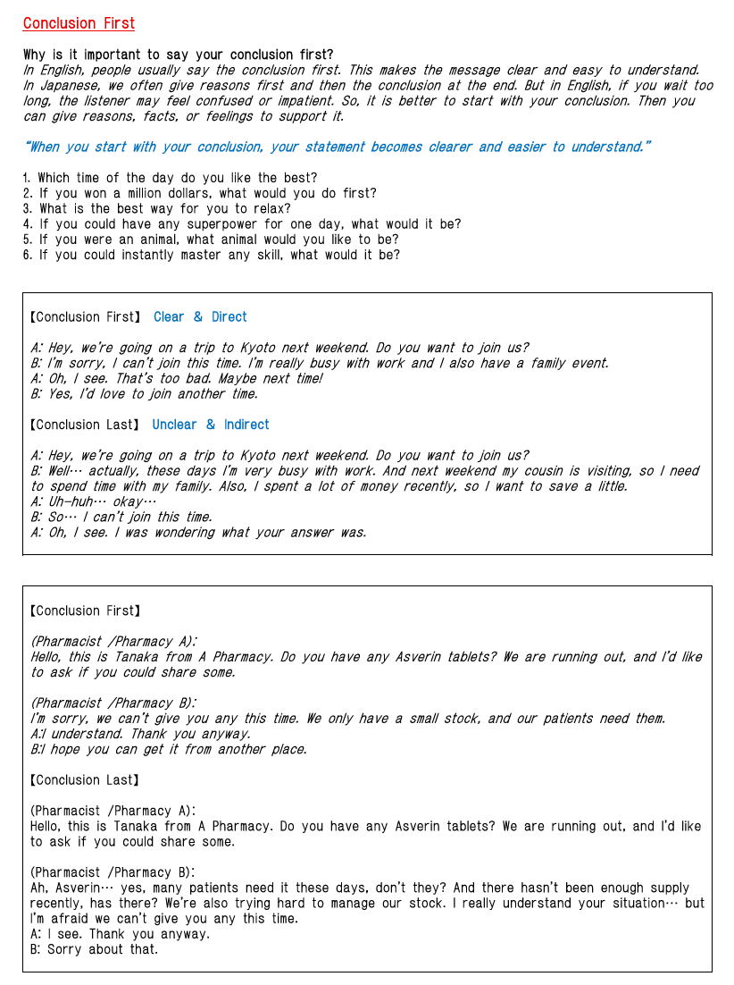 日本語では理由を先に述べて最後に結論を言うことも往々にしてありますが、明快なコミュニケーションの場、特に英会話においては、聞き手が混乱 したりイライラしたりするのを避けるため、まず結論から話すことが大切です。
